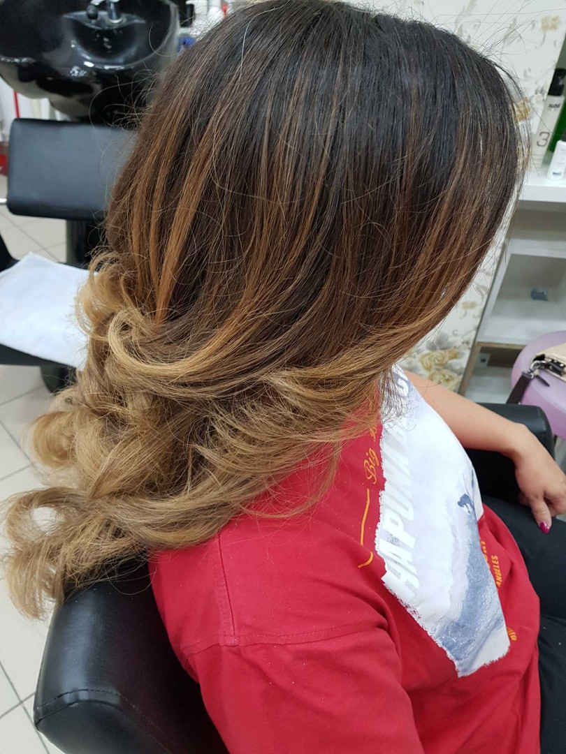 ombre u dve nijanse radjen dekolorizatorom i bojom i nakon toga lokne na kupu Lokne na presu / kupu - duga kosa Pranje kose ulazi u cenu usluge.