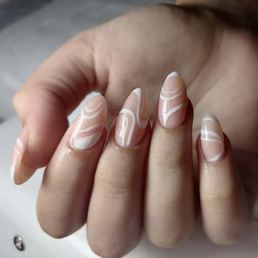 Izlivanje dugih noktiju, badem oblika, koji bude najlepši upravo kada imamo dužinu. Nude baza, i crtanje na svakom noktu elegantnih linije, koje daju sličan efekat kao french.