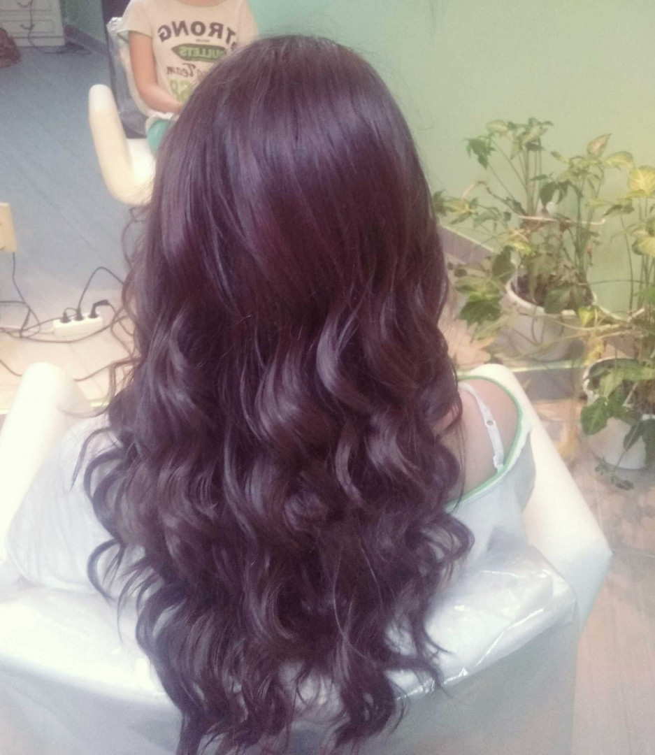 Rasčešljane lokne na kupu -efekat retro talasa. Korekcija prirodno smeđe boje pakovanjem u boji (color preliv - nepermanentna boja) Lokne na kupu - duga kosa bez pranja U cenu usluge ne ulazi pranje kose, već se dodatno zakazuje i naplaćuje.